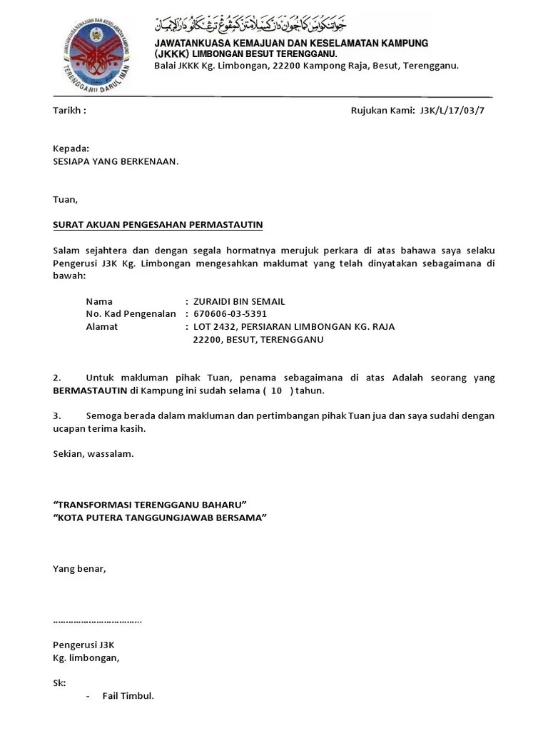 Surat Akuan Bermastautin - Prosedur Perkahwinan Islam Di Malaysia Update Love Is Cinta - Borang pengesahan tidak bekerja ptptn.. Kami sediakan tutorial untuk anda supaya anda boleh taip surat akuan yang tepat ikut akta akuan berkanun 1960. Adakah seperti surat akuan atau surat rasmi yang biasa aku tulis! Surat akuan sumpah (seperti yang telah ditetapkan)[diikrarkan di hadapan pesuruhjaya sumpah. Pemohon hendaklah bermastautin 7 hari + 1 hari di daerah perkahwinan sebelum mengemukakan borang permohonan keputusan semakan surat akuan bujang luar negara (surat kebenaran). Surat akuan pengenalan merupakan dokumen perjalanan antarabangsa yang dikeluarkan jabatan imigresen malaysia kepada penduduk tetap malaysia yang dikeluarkan kepada pemastautin tetap malaysia yang tidak mempunyai taraf kewarganegaraan.